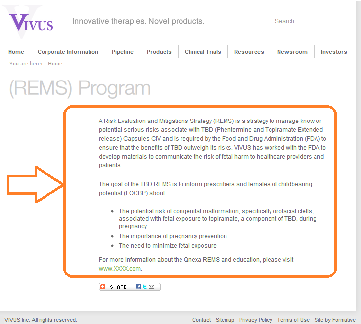 Vivus has prepared a webpage on it’s site that outlines a potential REMS program. This site has the trade name etched out with “TBD” in it’s place. Furthermore the link appears to be a generic placeholder. But the content is notable for the following statement: