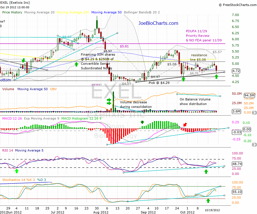 In the biotech sector, along with technical analysis (including indicators & momentum), I’m focusing primarily on the fundamental side, as the catalyst is mostly driving the price action. Moreover $EXEL is getting very close to the PDUFA date (just 5 weeks till the decision day on 11/29/2012) so I think that more interest is coming & more catalyst traders will start taking positions in this name bringing a boost to the price & creating a new uptrend.