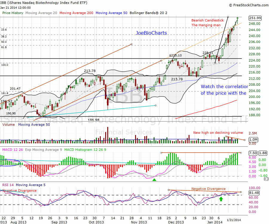 The best indicator for our biotech portfolios are biotechnology indices such as IBB, NBI, XBI or XLV. By looking at the IBB daily chart, we get the whole picture of the latest epic run in the biotech sector during 2013, with a whopping run from 134.21 to 227.06 points, gaining 69.2%, while keeping the positive momentum through today. Positive momentum is what we investors or traders have experienced in the past 12 trading days, adding another 11.1% gain YTD. The index printed a new All-Times-High at 252.18 points, but closed a bit lower, creating a Bearish Doji candlestick called “The Hanging Man” which forms at the end of an uptrend. It is created when there is a significant sell-off during the trading day but the bulls are able to push the index back up so it closes at or near the opening price. Generally, the large sell-off is seen as an early indication that the bulls are losing control to the bears or demand for biotech stocks is waning.